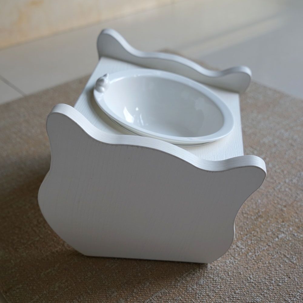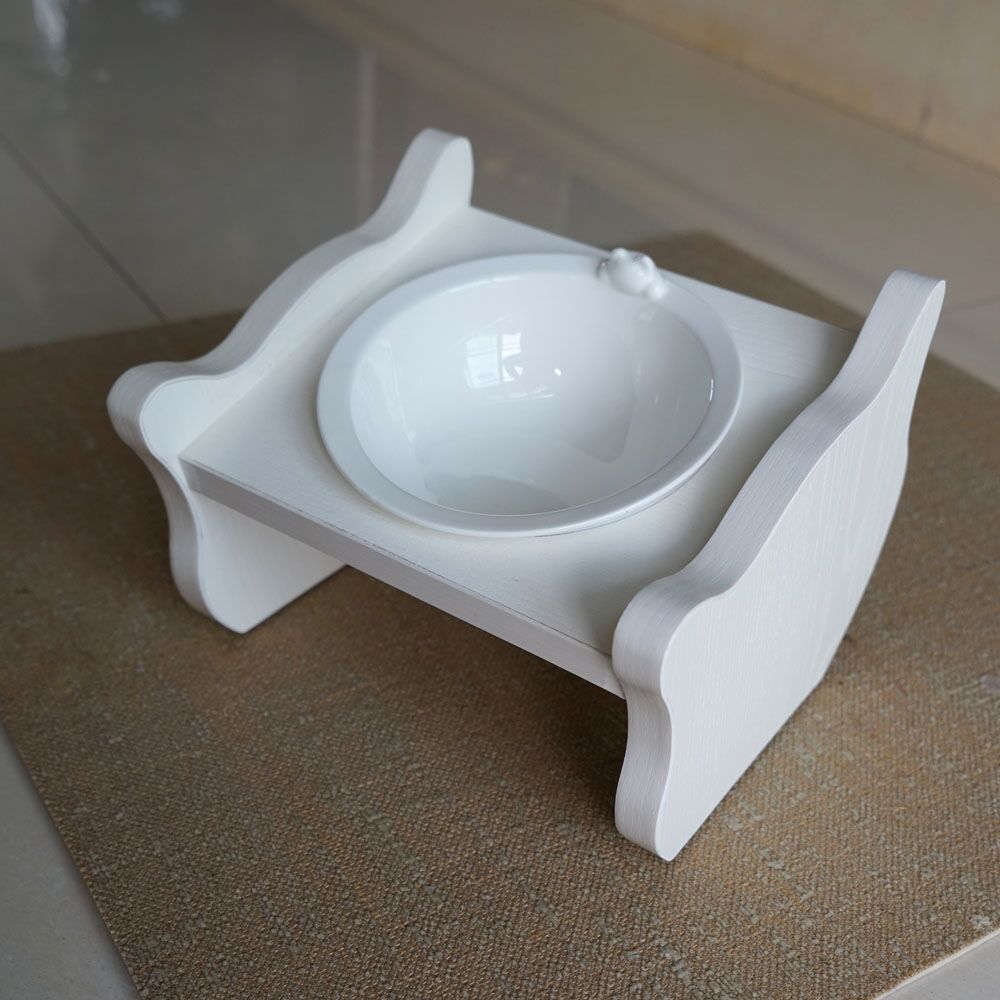 - Hochwertige Holzgestell mit Porzellannapf.